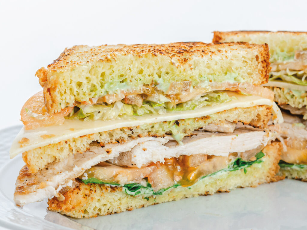 Sándwich de pollo a la plancha en pan de molde brioche con alioli de albahaca, rúcula, lechuga y tomate.