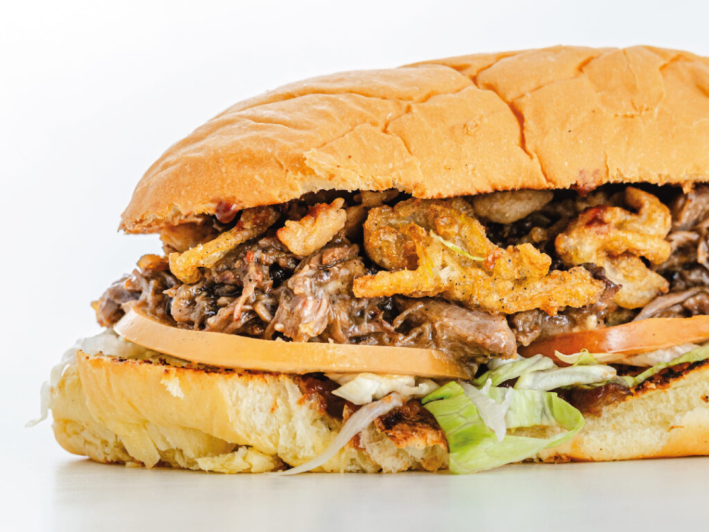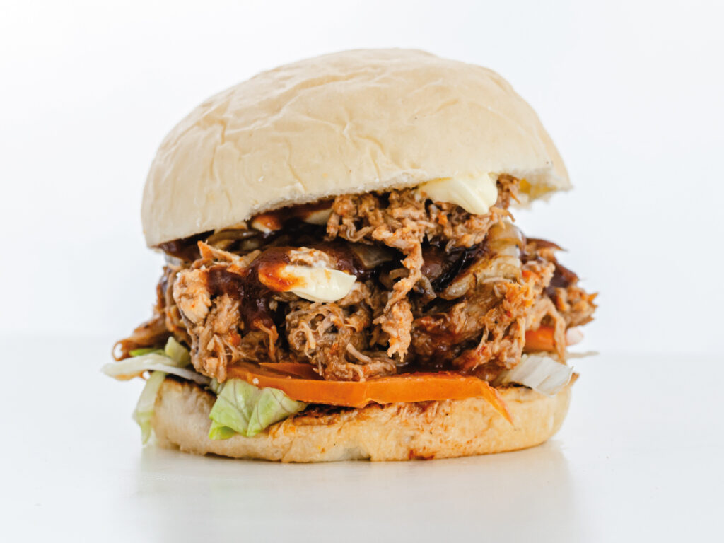 Sándwich de carne desmechada en pan brioche con salsa bbq, lechuga, tomate y cebolla crispy.