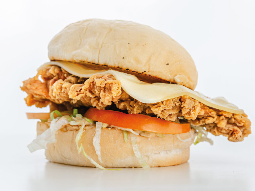 Sándwich de pollo crujiente en pan de papa con lechuga, tomate, queso y salsa mil islas.