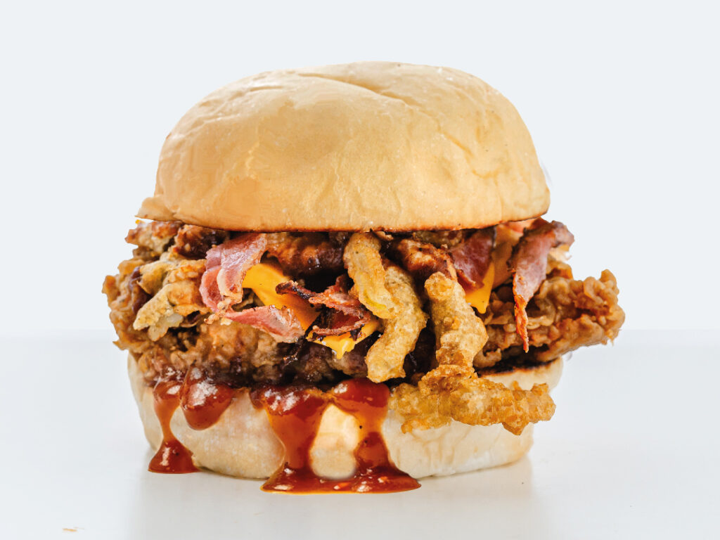 Sándwich de pollo crujiente en pan de papa con salsa bbq, bacon, cebolla morada y cheddar.