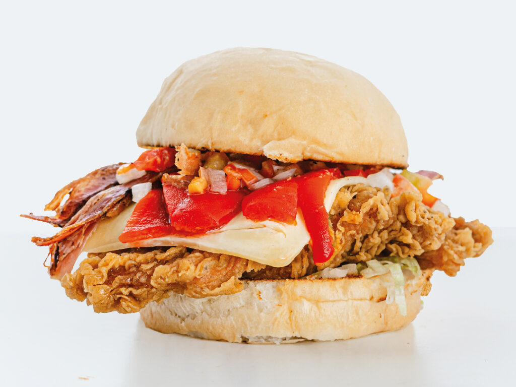 Sándwich de pollo crujiente en pan de papa con lechuga, pimientos asados, mayonesa, queso, panceta y salsa.