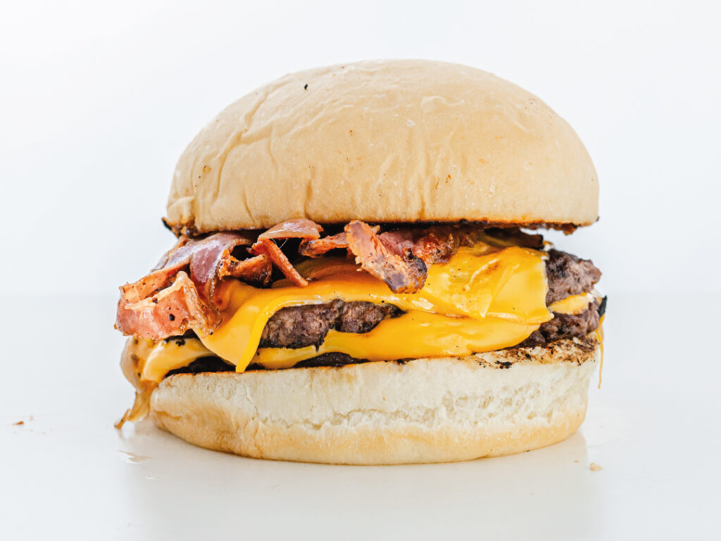 Medallón de carne en pan de papa con salsa bbq, cheddar y panceta crocante. En sus dos versiones: doble y simple.