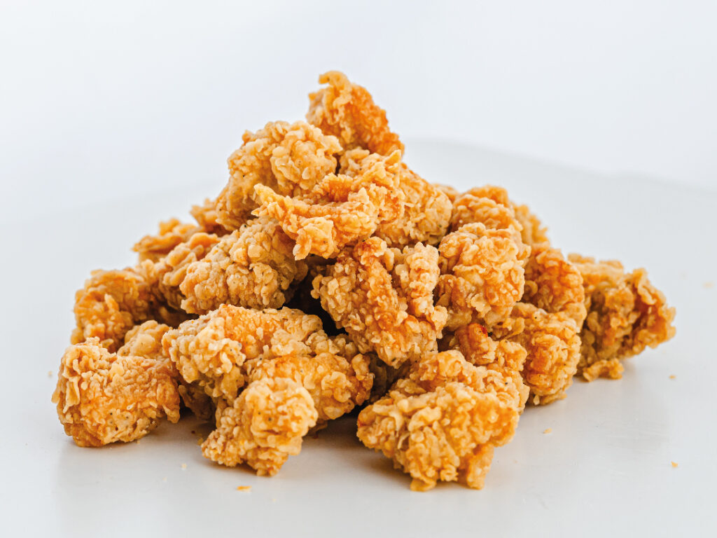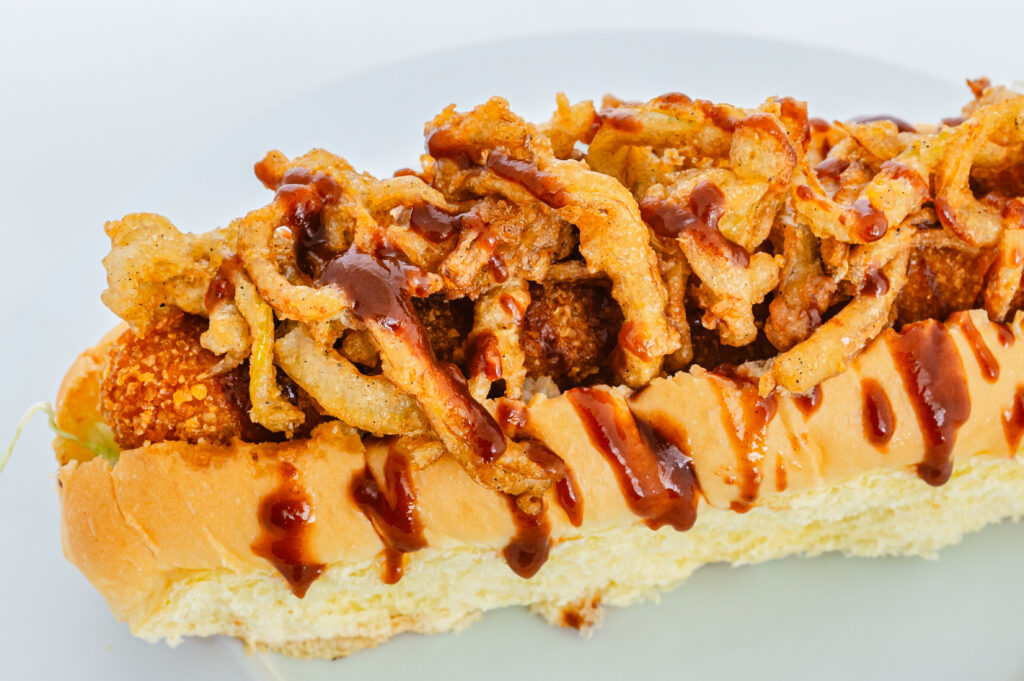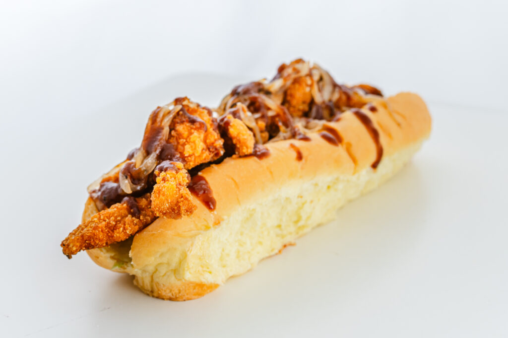 Exquisitos bocaditos de pollo crocante, en pan de viena cubiertos por cebolla crispy y salas bbq.