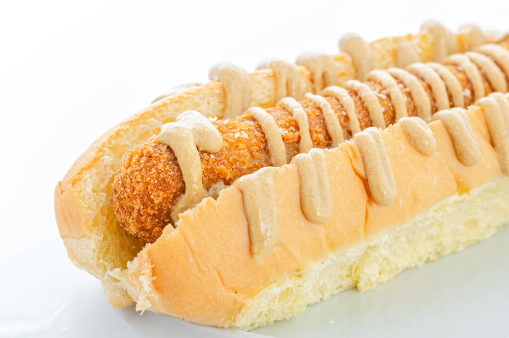 Super pancho relleno de queso, rebosado con una capa crocante, en pan de viena, cubierto en alioli.